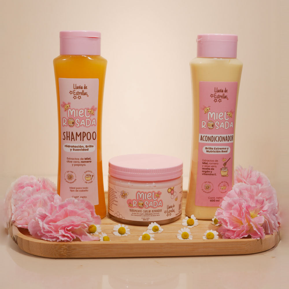 Nuestro Acondicionador Miel Rosada llega directo de la colmena a tu cabello para envolverlo en una experiencia de nutrición profunda, suavidad y brillo extremo. Su textura cremosa ayuda a desenredar fácilmente mientras restaura la hidratación natural de cada hebra, dejando el cabello más sedoso, manejable y visiblemente saludable.